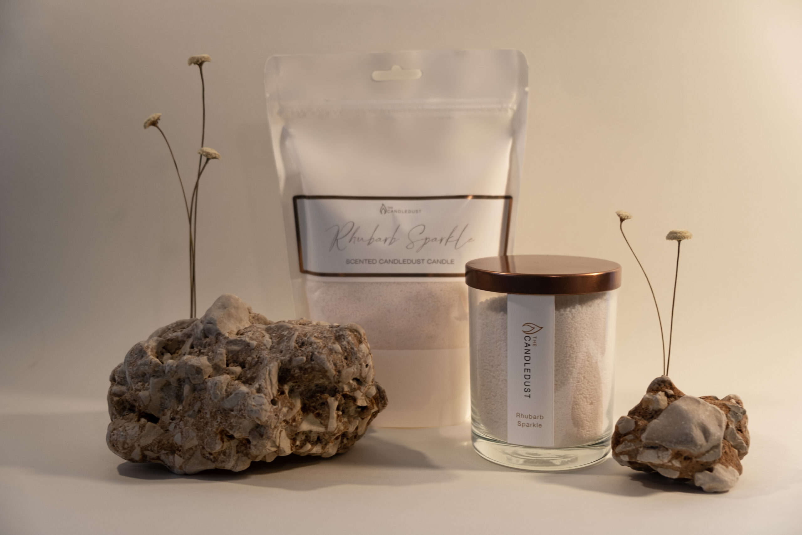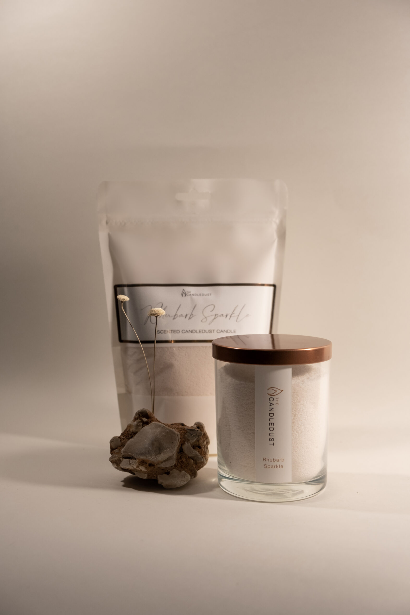 Setul include o lumânare în pahar din sticlă, realizată din granule de ceară vegetală, gata de aprins, alături de un refill care îți permite să îi dai o nouă viață după ce fitilul se consumă.